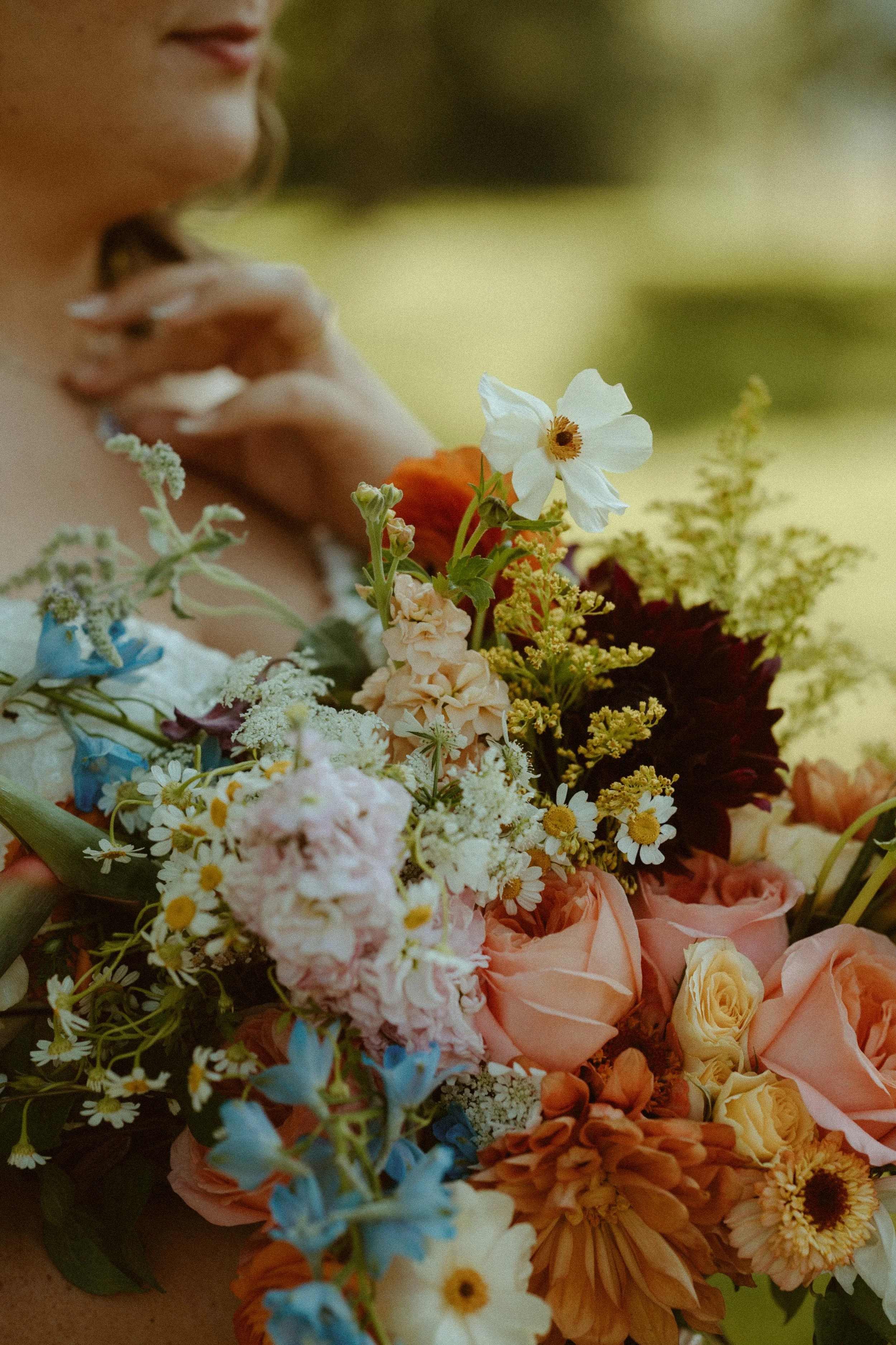 Nora is anything but traditional. She wanted to really have funky wedding colors that showed her and her fiance’s personalities. Marigold was a color she wanted accented and we sprinkled that color in all the bouquets. We also used our own stock of orlaya, dahlias, and stock to complete her design. We absolutely loved designing this wildflower themed wedding.