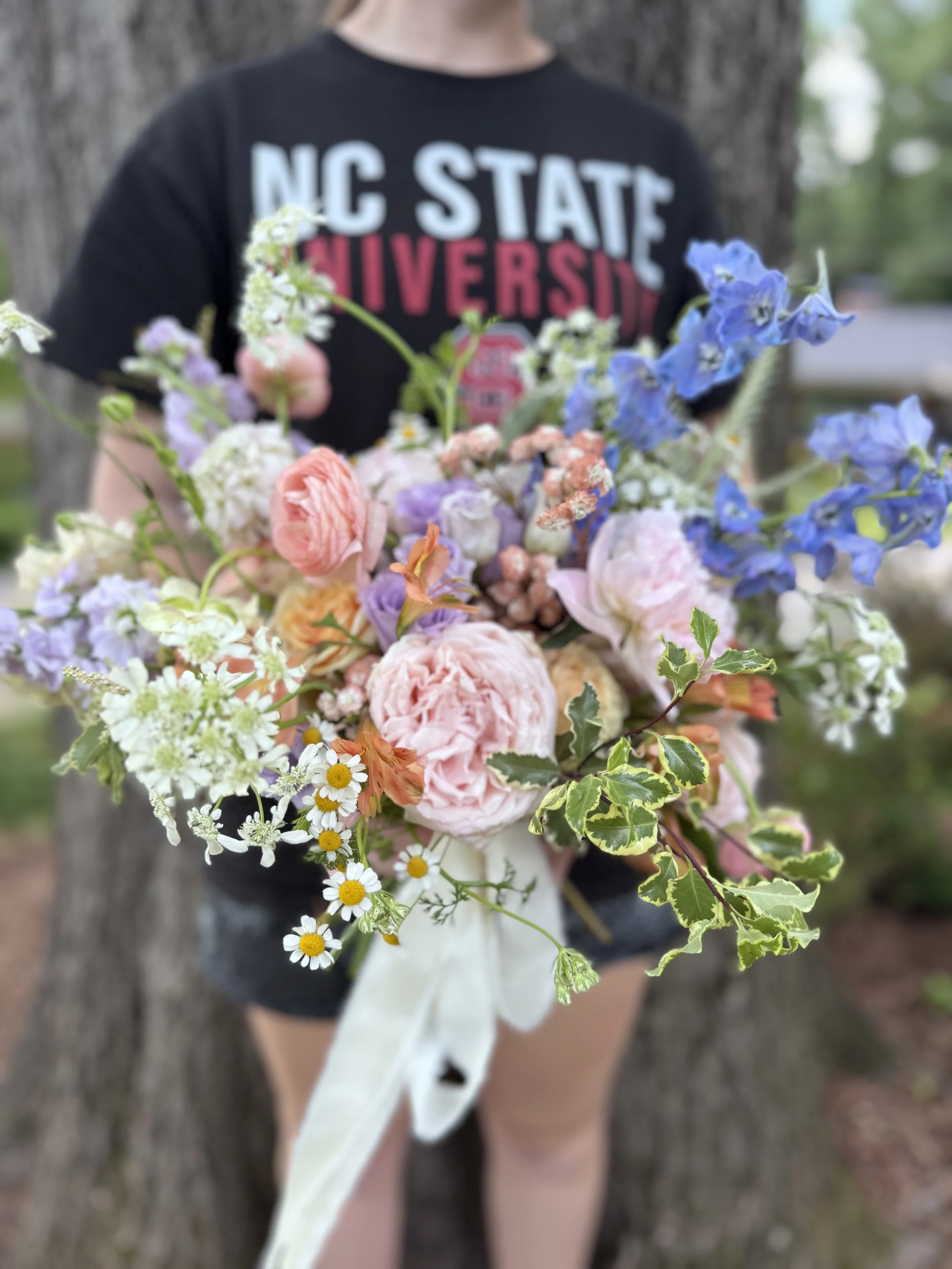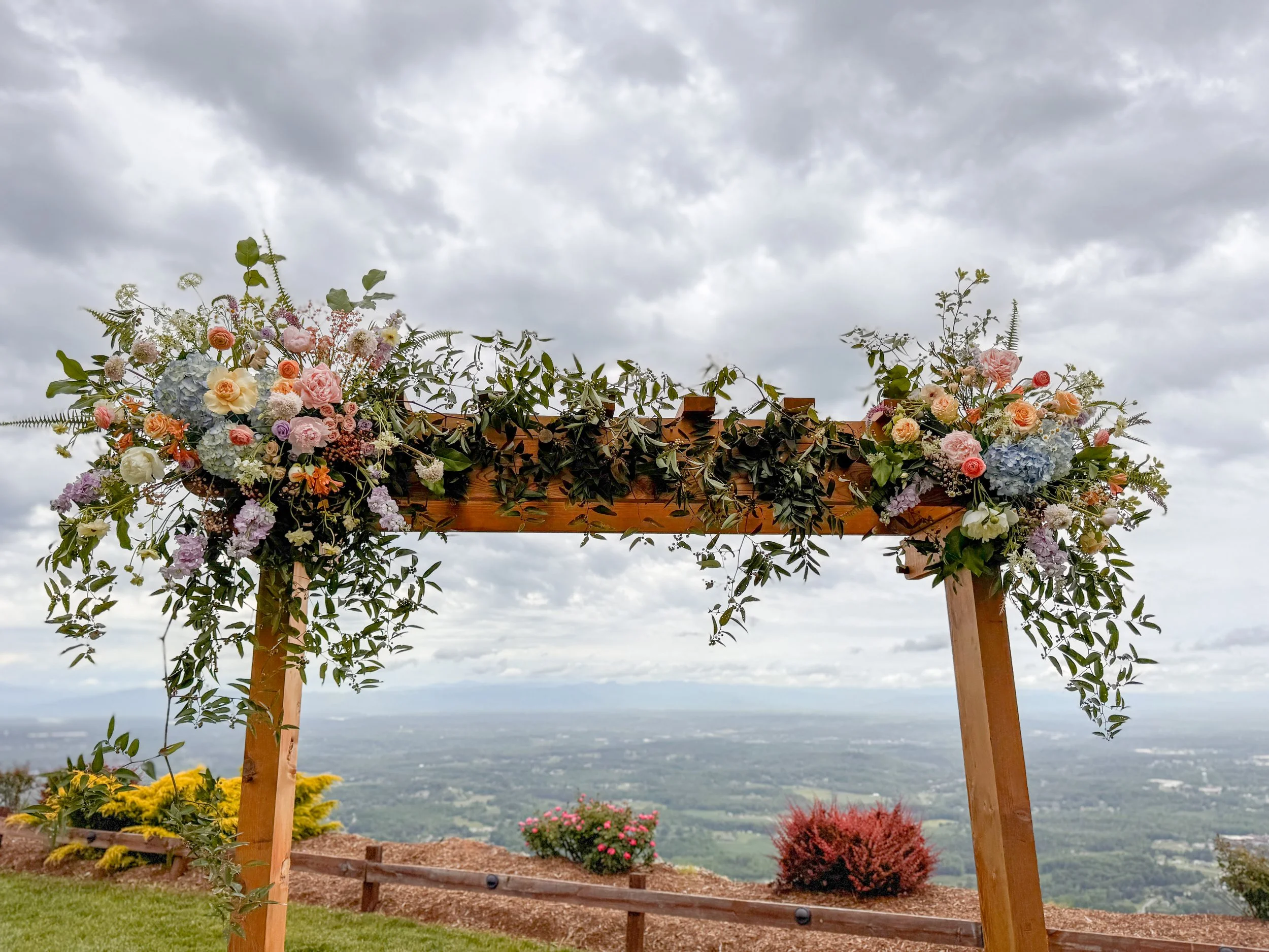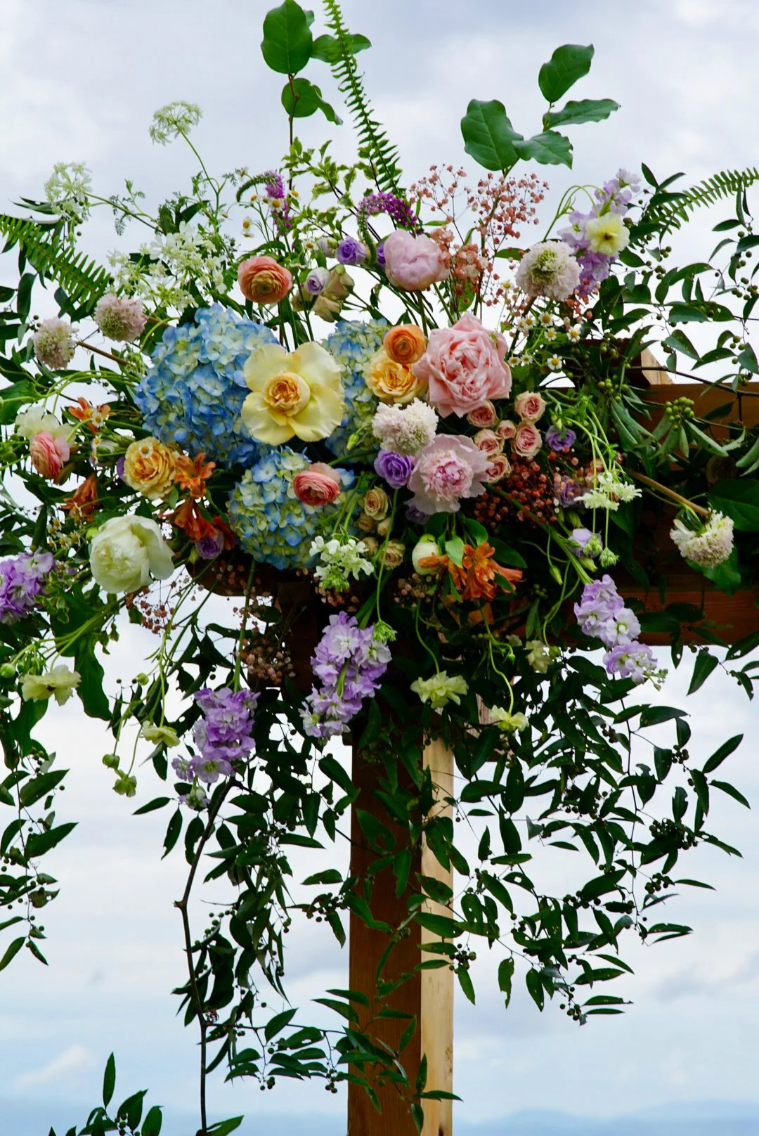Bursting with color and organic textures, the wedding florals and ceremony arrangements were designed for a bride who envisoned a wildflower inspired aesthetic that was natural yet artful. Clusters of soft blue hydrangea to anchor pieces interwoven with delicate blush and peach roses and playful sprigs of lavender stock and blue delphinium. And to top off the arrangements with airy greenery, trailing vines creating movement for an effortless garden feel.